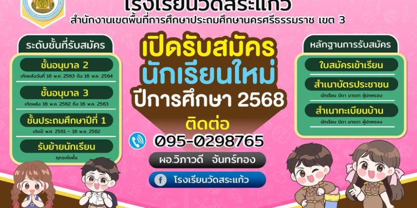 ประกาศรับสมัครนักเรียน ปีการศึกษา 2568 Posted on 31 มกราคม 2025 by 80030018 เมนูนำทาง เรื่อง « ผู้อำนวยการโรงเรียนวัดสระแก้ว เข้าร่วมการประชุมคณะทำงานระดับศูนย์สอบการทดสอบทางการศึกษาระดับชาติขั้นพื้นฐาน (O-NET) ระดับประถมศึกษาปีที่ 6 และระดับมัธยมศึกษาปีที่ 3 ปีการศึกษา 2567 ศูนย์สอบ สำนักงานเขตพื้นที่การศึกษาประถมศึกษานครศรีธรรมราช เขต 3พัฒนาการจัดการเรียนรู้ ในชุมชนการเรียนรู้ทางวิชาชีพ ( PLC ) และเตรียมความพร้อมการประเมินสถานศึกษาแบบอย่างการจัดกิจกรรมการเรียนรู้และการบริหารจัดการตามหลักปรัชญาของเศรษฐกิจพอเพียง (สถานศึกษาพอเพียง) »
