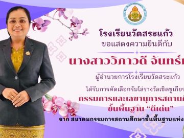 ขอแสดงความยินดีกับ “นางสาววิภาวดี จันทร์ทอง ผู้อำนวยการโรงเรียนวัดสระแก้ว” ได้รับการคัดเลือกให้ได้รับโล่รางวัลเชิดชูเกียรติ “ กรรมการและเลขานุการสถานศึกษาขั้นพื้นฐาน” “ดีเด่น” ประจำปี 2567