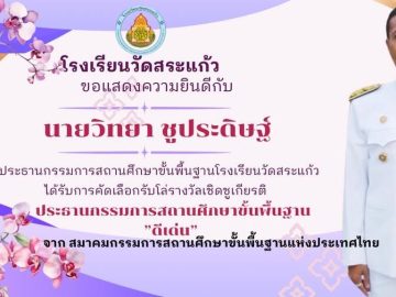 ขอแสดงความยินดีกับ “นายวิทยา ชูประดิษฐ์ ประธานกรรมการสถานศึกษาขั้นพื้นฐานโรงเรียนวัดสระแก้ว” ได้รับการคัดเลือกให้ได้รับโล่รางวัลเชิดชูเกียรติ “ ประธานกรรมการสถานศึกษาขั้นพื้นฐาน” “ดีเด่น” ประจำปี 2567
