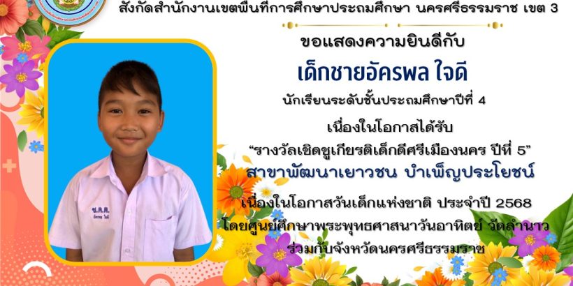 รางวัลเชิดชูเกียรติเด็กดีศรีเมืองนคร Posted on 8 มกราคม 2025 by 80030042 เมนูนำทาง เรื่อง « ครูผู้มีจรรยาบรรณวิชาชีพดีเด่น ประจำปี 2568การแข่งขันงานศิลปหัตถกรรมนักเรียน ครั้งที่ 72 »