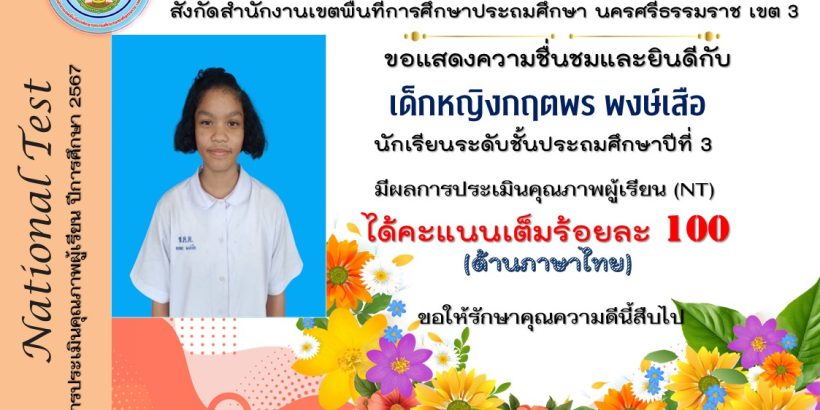 ผลการสอบระดับชาติการประเมินคุณภาพผู้เรียน (์NT: National Test) ของนักเรียนระดับชั้นป. 3