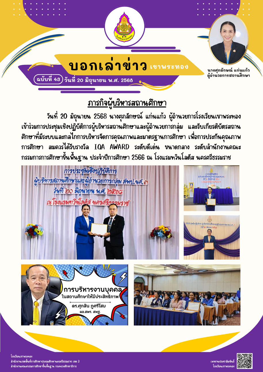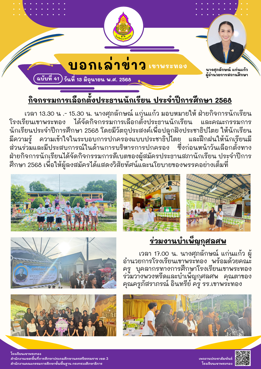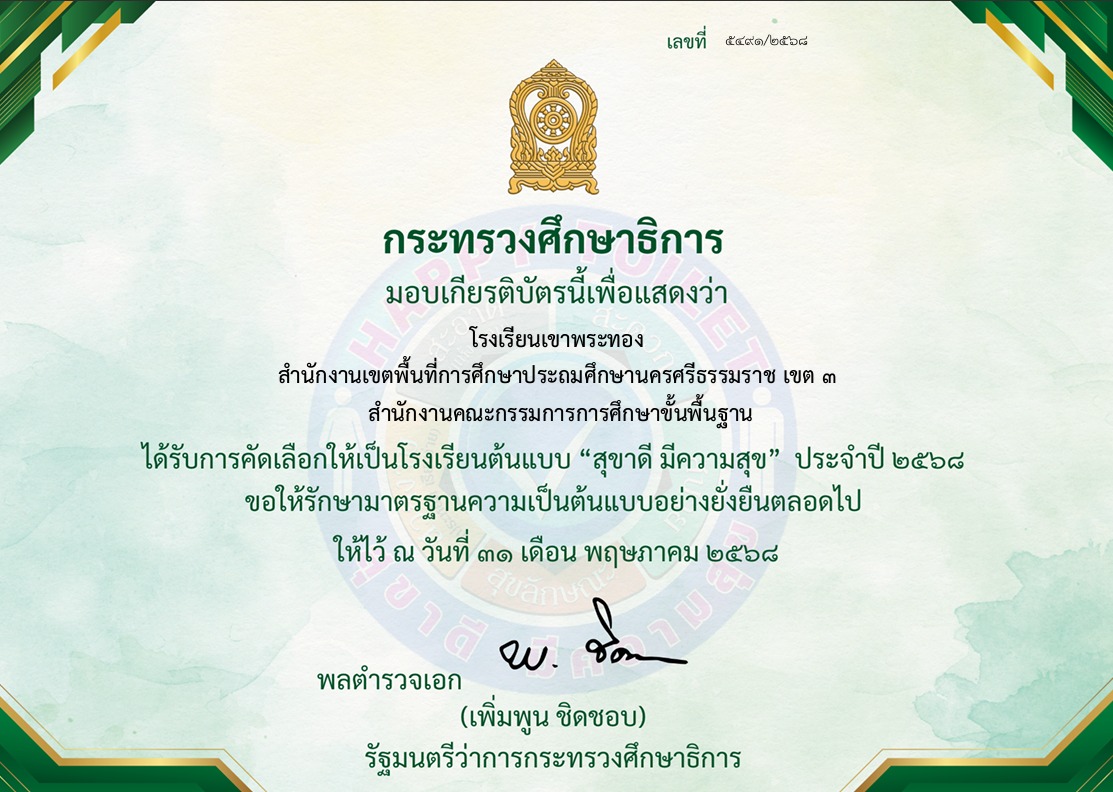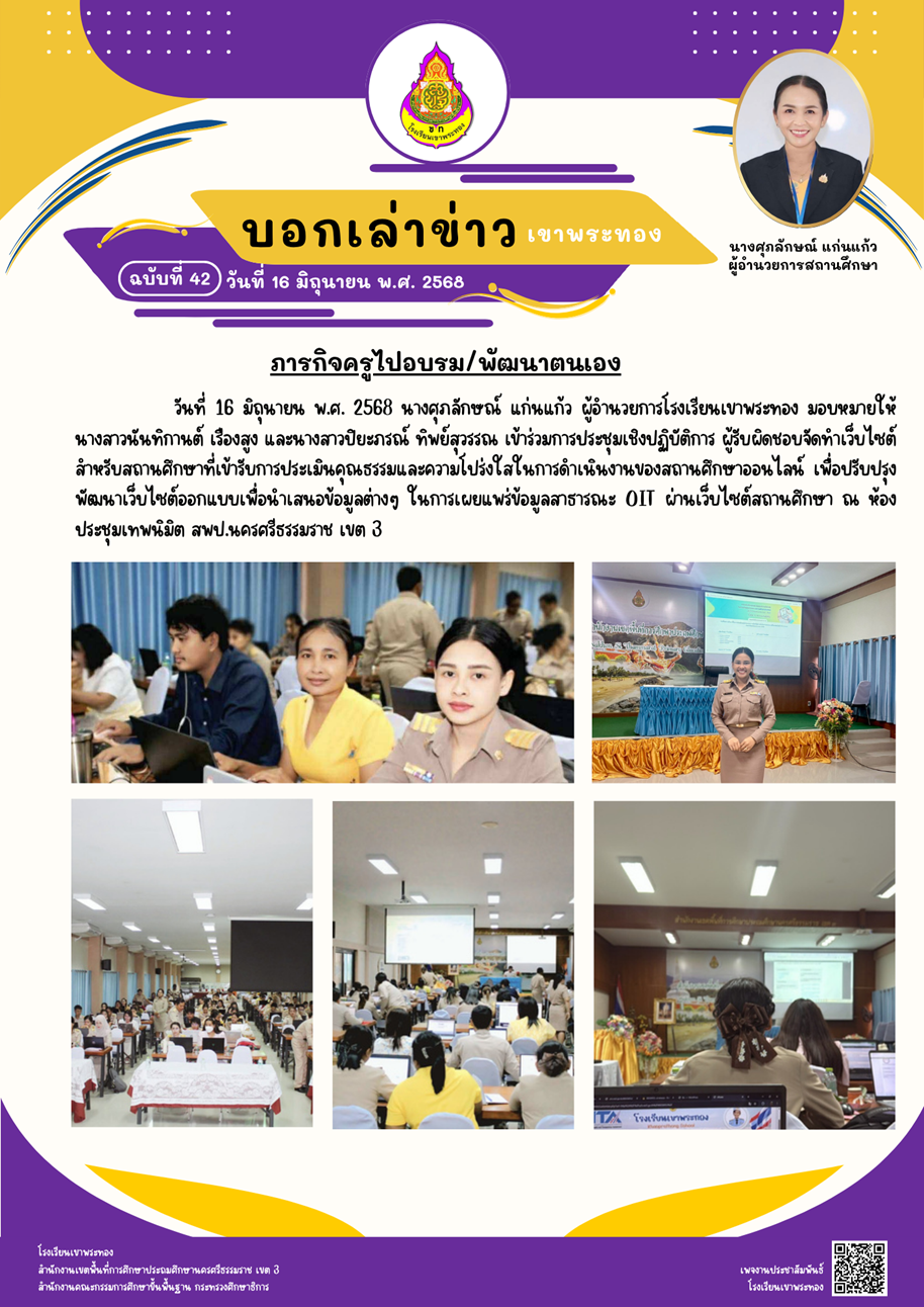 ข่าวประชาสัมพันธ์ โรงเรียนเขาพระทอง สพป.นครศรีธรรมราช เขต 3 ได้รับรางวัลการคัดเลือกให้เป็นโรงเรียนต้นแบบ “สุขาดี มีความสุข” ประจำปี 2568 โรงเรียนเขาพระทอง สพป.นครศรีธรรมราช เขต 3 เป็นสถานศึกษาที่มีระบบและกลไกการบริหารจัดการคุณภาพและมาตรฐานการศึกษา เพื่อการประกันคุณภาพการศึกษา สมควรได้รับรางวัล IQA AWARD ระดับดีเด่น ขนาดกลาง ระดับสำนักงานคณะกรรมการการศึกษาขั้นพื้นฐาน ประจำปีการศึกษา 2566 📬บอกเล่าข่าว…เขาพระทอง💜💛 (ฉบับที่ 42/2568) 📍ภารกิจครูไปอบรม/พัฒนาตนเอง วันที่ 16 มิถุนายน พ.ศ. 2568 นางศุภลักษณ์ แก่นแก้ว ผู้อำนวยการโรงเรียนเขาพระทอง มอบหมายให้นางสาวนันทิกานต์ เรืองสูง และนางสาวปิยะภรณ์ ทิพย์สุวรรณ เข้าร่วมการประชุมเชิงปฏิบัติการ ผู้รับผิดชอบจัดทำเว็บไซต์ สำหรับสถานศึกษาที่เข้ารับการประเมินคุณธรรมและความโปร่งใสในการดำเนินงานของสถานศึกษาออนไลน์ เพื่อปรับปรุงพัฒนาเว็บไซต์ออกแบบเพื่อนำเสนอข้อมูลต่างๆ ในการเผยแพร่ข้อมูลสาธารณะ OIT ผ่านเว็บไซต์สถานศึกษา ณ ห้องประชุมเทพนิมิต สพป.นครศรีธรรมราช เขต 3 📬บอกเล่าข่าว…เขาพระทอง💜💛 (ฉบับที่ 41/2568) 📍วันที่ 13 มิถุนายน พ.ศ. 2568 กิจกรรมการเลือกตั้งสภานักเรียนปีการศึกษา 2568