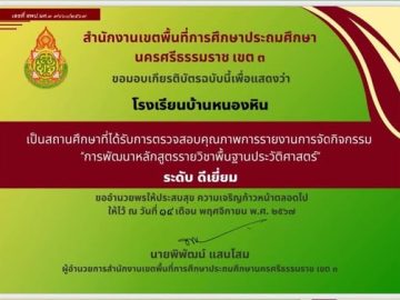 โรงเรียนบ้านหนองหินได้รับการตรวจสอบคุณภาพการรายงานการจัดกิจกรรม “การพัฒนาหลักสูตรรายวิชาพื้นฐานประวัติศาสตร์” ระดับดีเยี่ยม