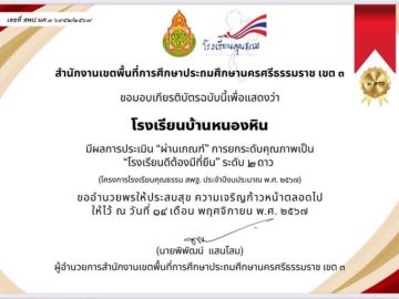 ๑๔ พฤศจิกายน ๒๕๖๗ โรงเรียนบ้านหนองหินได้รับการประเมิน มีผลการประเมิน “ผ่านเกณฑ์” การยกระดับคุณภาพเป็น “โรงเรียนดีต้องมีที่ยืน” โรงเรียนคุณธรรม สพฐ. ระดับ ๒ ดาว ⭐️⭐️